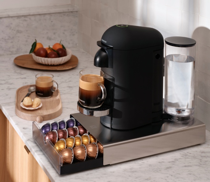 Designed by Konstantin Grcic, its semi-transparent front is perfect for keeping track of your capsules. With a sleek design and a robust steel exterior, it fits right under your Nespresso machine, to optimise kitchen space so you can enjoy your coffee moments.