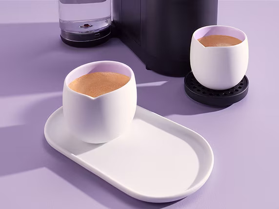 Vsaka skodelica je izdelana iz porcelana z dvojno steno in vaš napitek drži v svojem majhnem „kokonu“. Oblikovala jo je India Mahdavi, njena oblika pa je navdihnjena s kavnim zrncem, z mat belim zunanjim delom in lakiranim notranjim delom v nežni barvi sivke. Za trenutke kave, ki vas popeljejo nazaj skozi čas.
