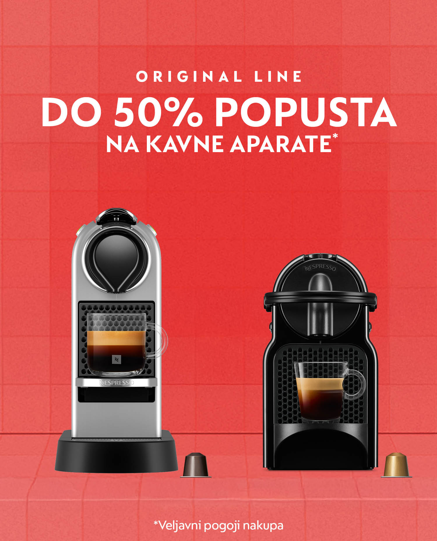 Znižani kavni aparati so označeni z nalepko. Določeni aparati v akciji morda začasno niso dobavljivi zaradi razprodaje zalog.